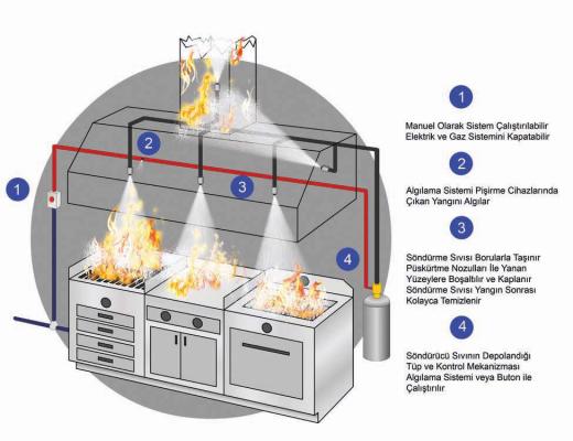 Boşaltma mekanizması algılama hattının devreye girmesi sonucu kızgın yağ yangınları için özel olarak geliştirilmiş düşük PH seviyesine sahip potasyum karbonat bazlı sıvı söndürücünün boşaltma hattından hızlı bir şekilde boşalmasını sağlar.